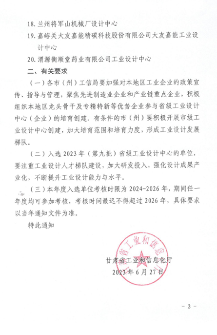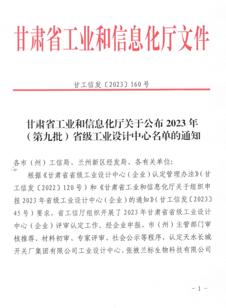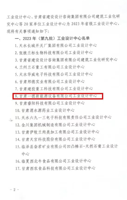 6月27日,甘肅省工信廳公布了2023年(第九批)省級工業(yè)設計中心名單,白銀高新區(qū)企業(yè)甘肅一德新能源設備有限公司成功獲批省級工業(yè)設計中心。截止目前,白銀高新區(qū)已累計認定省級工業(yè)設計中心5家。